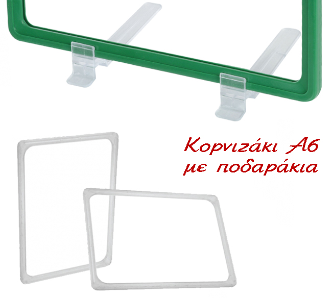 Πλαστικό κορνιζάκι σε μέγεθος Α6, διάφανο, με δύο διάφανα ποδαράκια ώστε μα στέκεται μόνο του στο δάπεδο ή στον πάγκο.